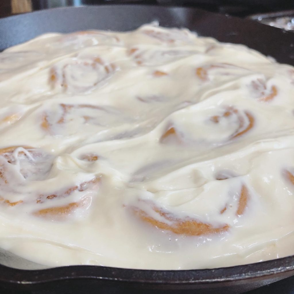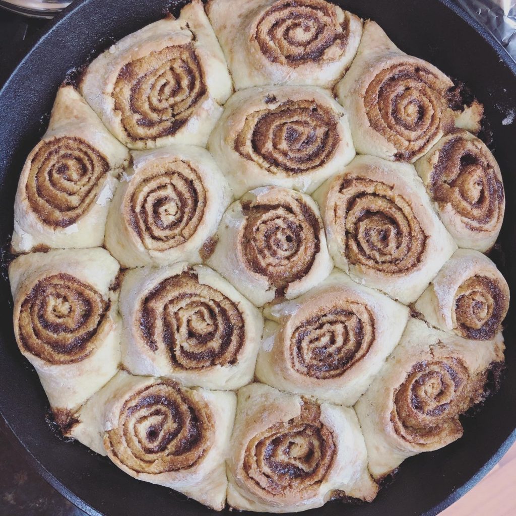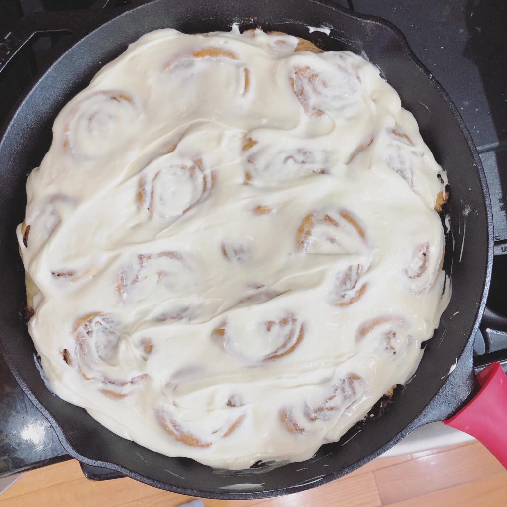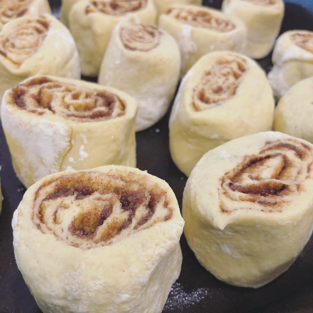 - Place the rolls in your baking dish, allowing room in between for expansion. I prefer to bake in my 12-inch cast iron skillet, but a glass 9x13 should work just fine as well.