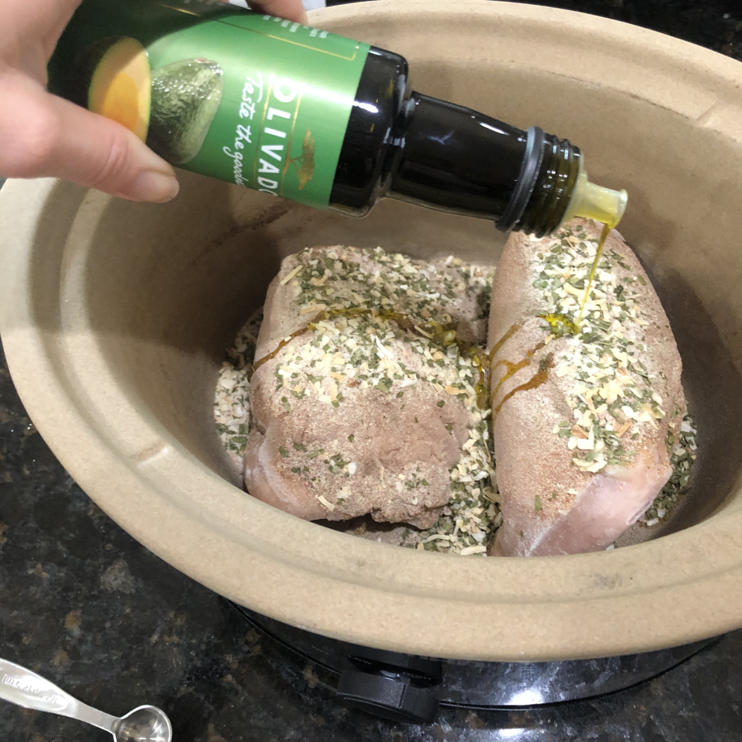 - Add chicken breast, avocado oil, and both seasoning mixes to the crockpot.