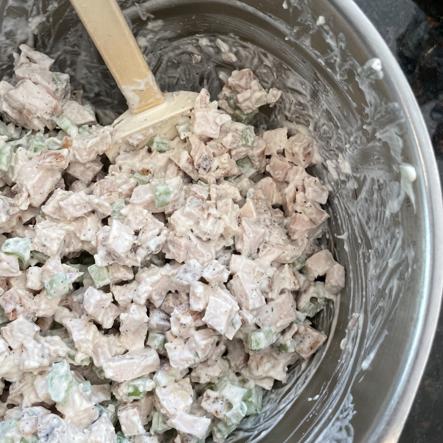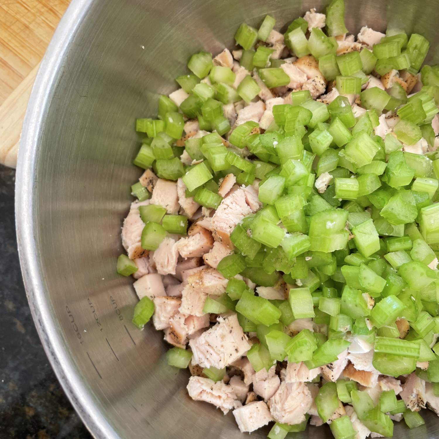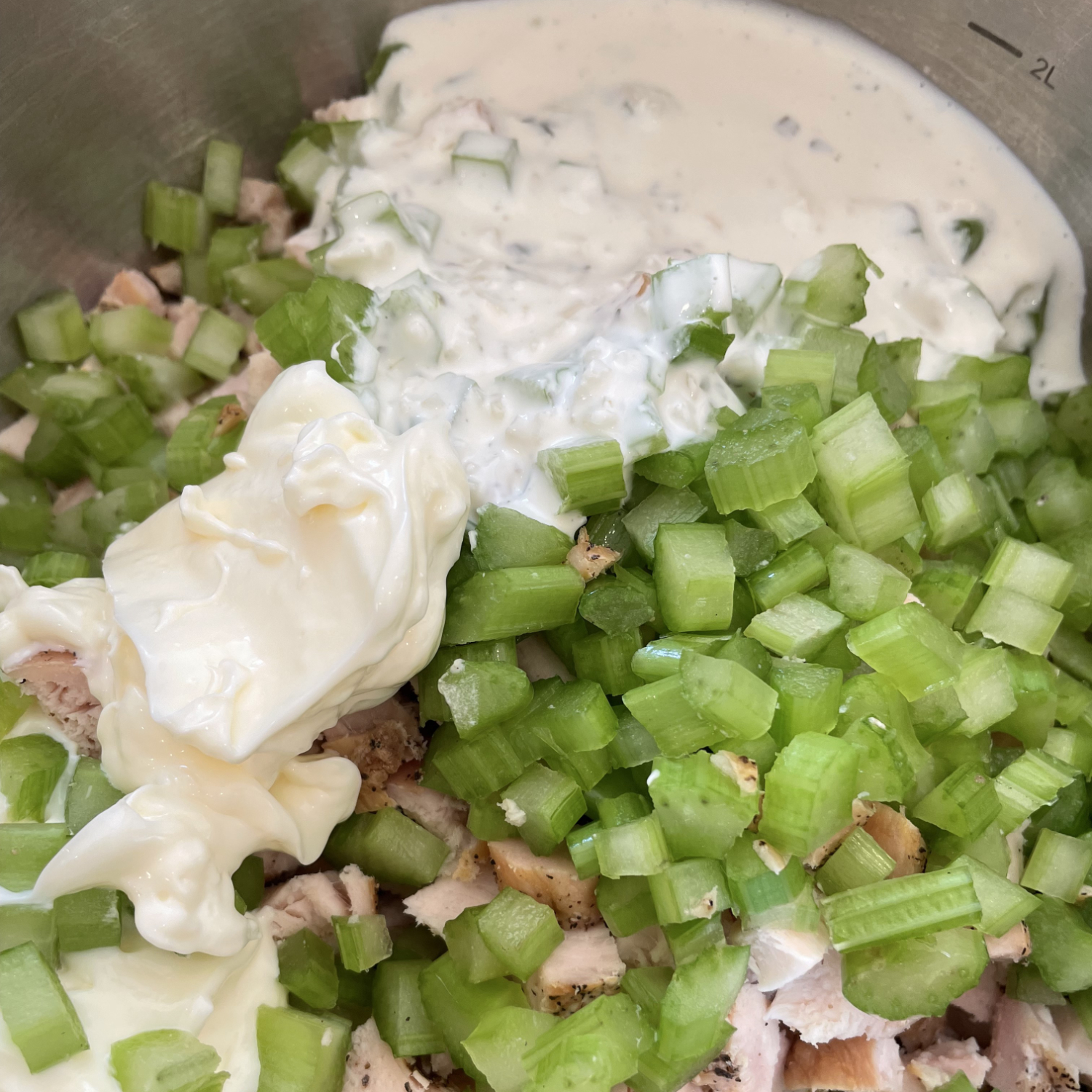 - Add the 1/2 cup of ranch and the 1/2 cup of mayonnaise to the chicken and celery. Mix until well combined.