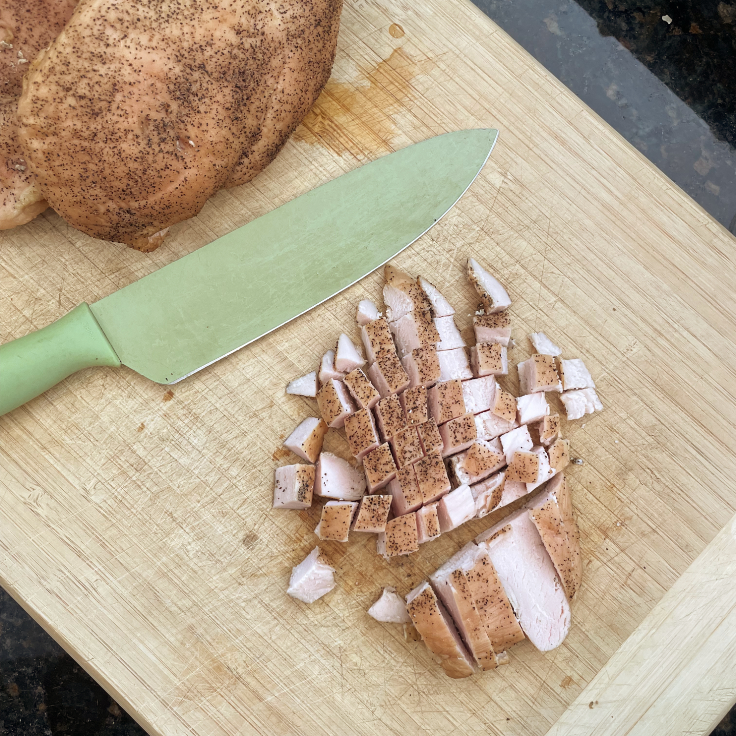 - Chop the chicken into small bite-sized pieces and place in a medium mixing bowl.