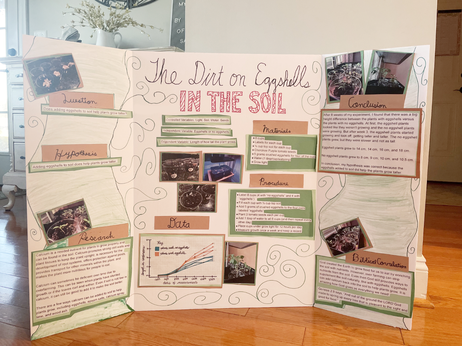 My daughter’s recent science fair project was super fascinating for gardening enthusiasts and wannabe homesteaders. Discovering through research that plants need calcium for basically all processes to develop and grow healthily, she hypothesized that adding eggshells to soil would help plants grow taller. She wasn’t sure if adding crushed up eggshells directly into the soil (not composting first) would prove fruitful, but she found online that many home gardeners do just that. After setting up 4 grow cups with plain soil and 4 grow cups with eggshell-amended soil (5 gm of eggshells each), she planted four Purple Cherokee tomato seeds in each cup. Her experiment measured the growth of the plants in both soils over the next seven weeks. Intriguingly, her hypothesis was wholeheartedly supported by the results. After growing the plants with all other variables constant, the plants in eggshell soil grew to heights of 14 cm, 16 cm, 16 cm, and 18 cm, while the plants in plain soil grew to a shorter 8 cm, 9 cm, 10 cm, and 10.5 cm. If ever there was an argument to add eggshells to your garden, this is the one!
