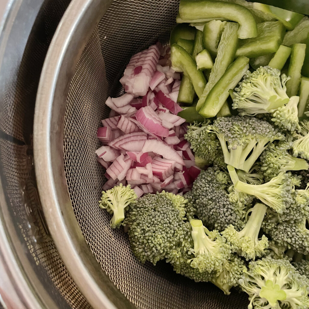 - Add all of the vegetables to an IP basket and steam in the Instant Pot (with one cup of water in the pot) on the manual setting for zero minutes. Yes, zero minutes - it's perfect! Release the steam immediately when finished to avoid over-steaming. If you are not using an Instant Pot, sauté all of the vegetables in a large skillet with the avocado oil over medium heat until cooked through, approximately 7-9 minutes. (If the timing works well, you may be able to use the noodle pot for this step instead to cut down on cleanup, but a skillet/sauté pan will probably work better.)