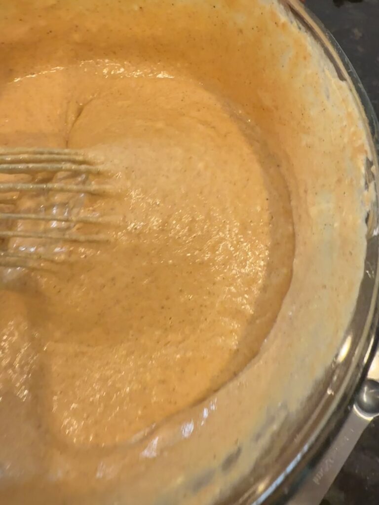 - Using a whisk, add into the dough the eggs, milk, pumpkin purée, vanilla extract, sea salt, baking soda, cinnamon, ginger, allspice, clove, and nutmeg. Mix until well combined.